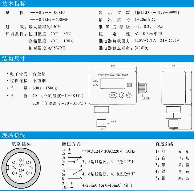 wp501型帶開關的壓力變送器采用世界優(yōu)秀的傳感器芯片為測壓元件,技術優(yōu)秀,質(zhì)量可靠,精度高,穩(wěn)定性好,體積小,重量輕,可直接過程安裝,帶數(shù)字顯示。